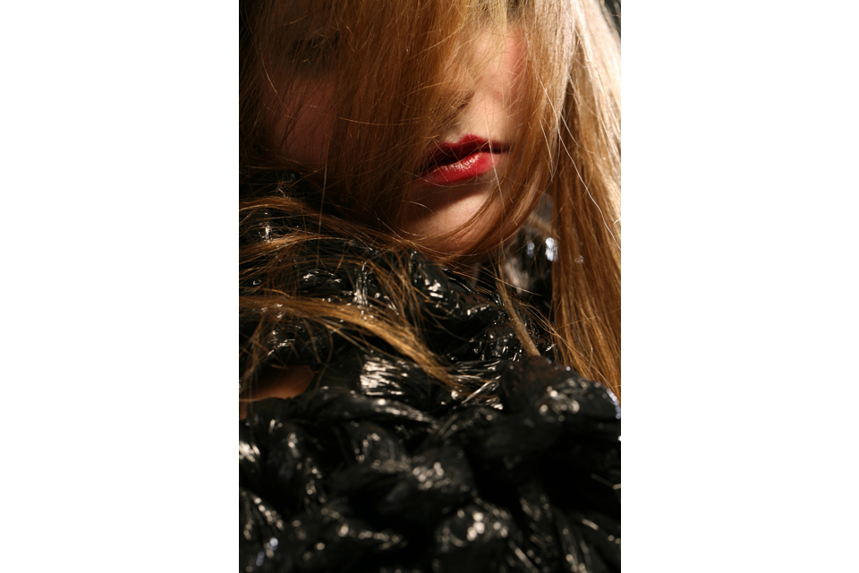 Eine Kollektion voller Kontraste und Gegensätze. Schön und... edel und... fein und... filigran und... zart und... zerbrechlich und... bedrohlich und... ruppig und... gefährlich und... . Liebliche Herzen auf zartem Seidenchiffon, mit Swarovski-Kristallen funkelnd bestickte Wolle, gesmokter Seiden- organza... Ein Eindruck des Märchenhaften durchzieht die Kollektion wie ein roter Faden... und doch gibt es das Schöne nicht ohne das Hässliche, das Gute nicht ohne das Böse. Als Gegenspieler agieren grobe Gestricke, rauh und derb, aus Polyvinyl- Folie und Kassettenband. Klare Konturen haben Ecken und Kanten. Drucke sind rissig, blättern ab. Säume fransen und lösen sich schließlich ganz auf. Die Grenzen zwischen Traum und Wirklichkeit ver- schwimmen. Nichts ist wie es scheint...