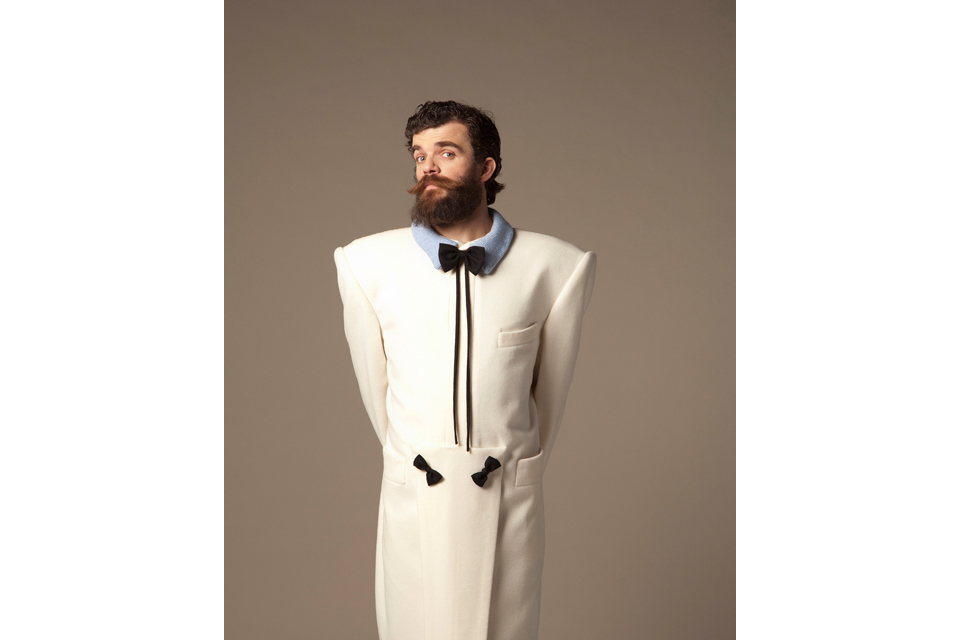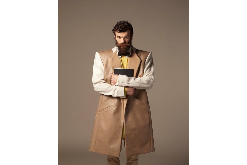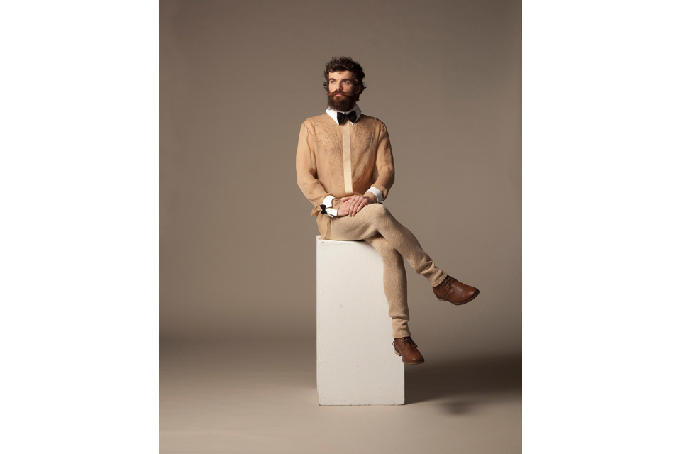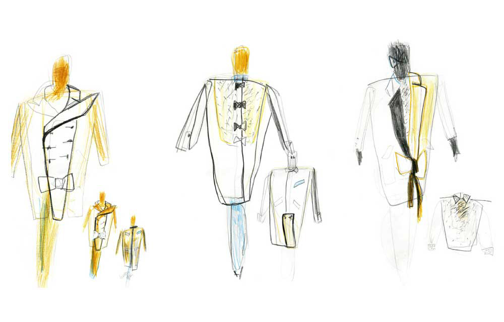 Breite Schultern, offene Hemden, Brusthaar. Glitzer, Flitter, enge Hosen. Das sind die 80er Jahre. Ich habe die V-Silhouette und die für mich typischen Charakteristika aufgegriffen und neu interpretiert. Legere Jacken wurden ersetzt durch klassische Mantelformen. Brusthaar quillt nicht aus offenen Ausschnitten, sondern wird direkt auf den Stoff gedruckt, sowohl auf die Brust als auch auf den Rücken. Die Farben sind zurückgenommen, damit die Form sich ungestört entfalten kann: beige, creme, taubenblau, rosé, zitronengelb. Fließender Seidenchiffon und feine Wollstoffe unterstreichen zugleich den femininen Charakter dieser Zeit. Die Fliege, zugleich die Schleife, verwirrt im Spiel um Männlichkeit und Weiblichkeit.