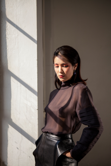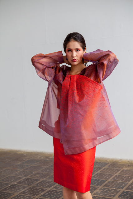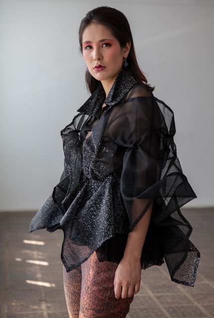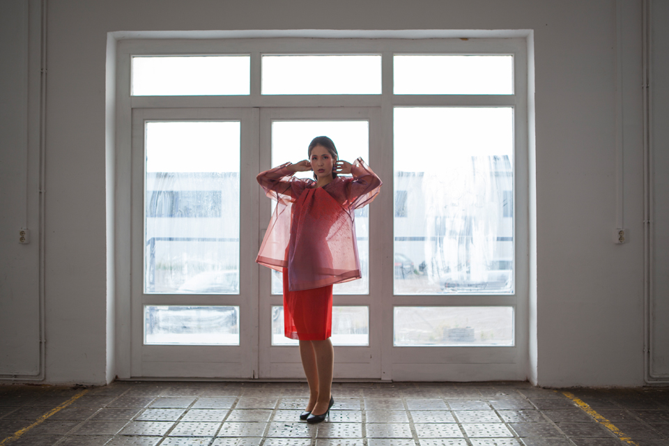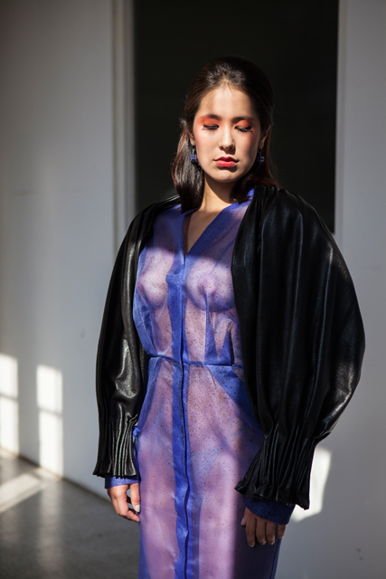 Blue Cloud. Eine Hommage an den Maler Mark Rothko und die Leuchtkraft der Farbe. Hauchzarter Seidenorganza und weiches Nappaleder sind die Malgründe, auf denen sich Handsiebdrucke zu noblen Farbklängen verdichten. Durch Überlagerung und Schichtung irisierender Flächen entstehen leidenschaftliche Kompositionen in Rot, Orange, Blau und Schwarz. Ausgewählte Schnitt- und Smoktechniken unterstützen den Effekt des Farbverlaufs. Raglan- und Kimonovariationen schaffen nahtlose Flächen und geben der Couleur Raum zum Atmen.