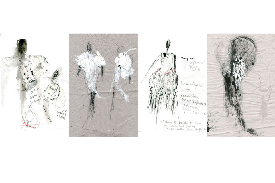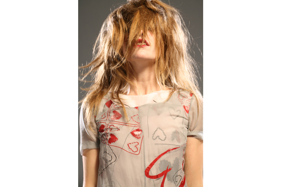 Eine Kollektion voller Kontraste und Gegensätze. Schön und... edel und... fein und... filigran und... zart und... zerbrechlich und... bedrohlich und... ruppig und... gefährlich und... . Liebliche Herzen auf zartem Seidenchiffon, mit Swarovski-Kristallen funkelnd bestickte Wolle, gesmokter Seiden- organza... Ein Eindruck des Märchenhaften durchzieht die Kollektion wie ein roter Faden... und doch gibt es das Schöne nicht ohne das Hässliche, das Gute nicht ohne das Böse. Als Gegenspieler agieren grobe Gestricke, rauh und derb, aus Polyvinyl- Folie und Kassettenband. Klare Konturen haben Ecken und Kanten. Drucke sind rissig, blättern ab. Säume fransen und lösen sich schließlich ganz auf. Die Grenzen zwischen Traum und Wirklichkeit ver- schwimmen. Nichts ist wie es scheint...