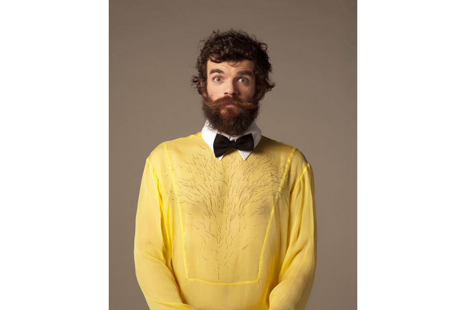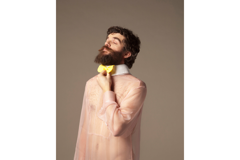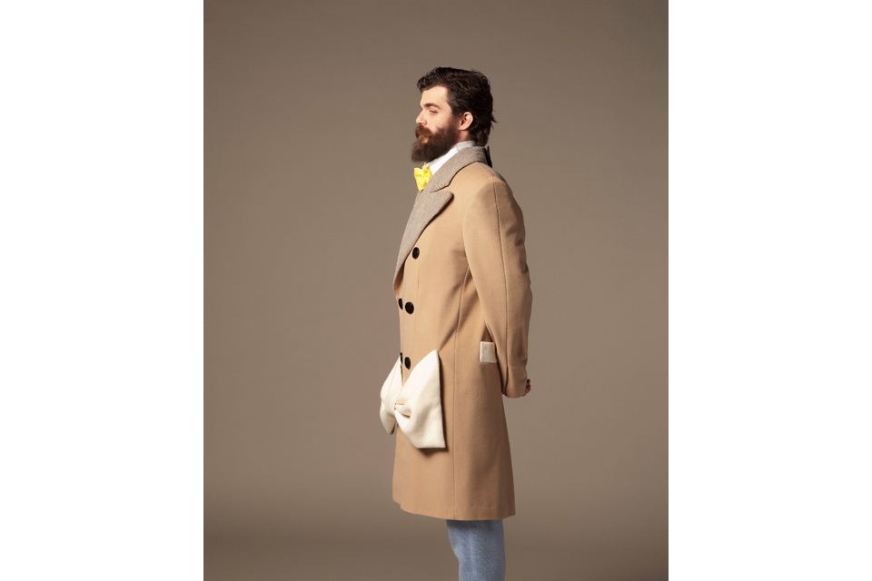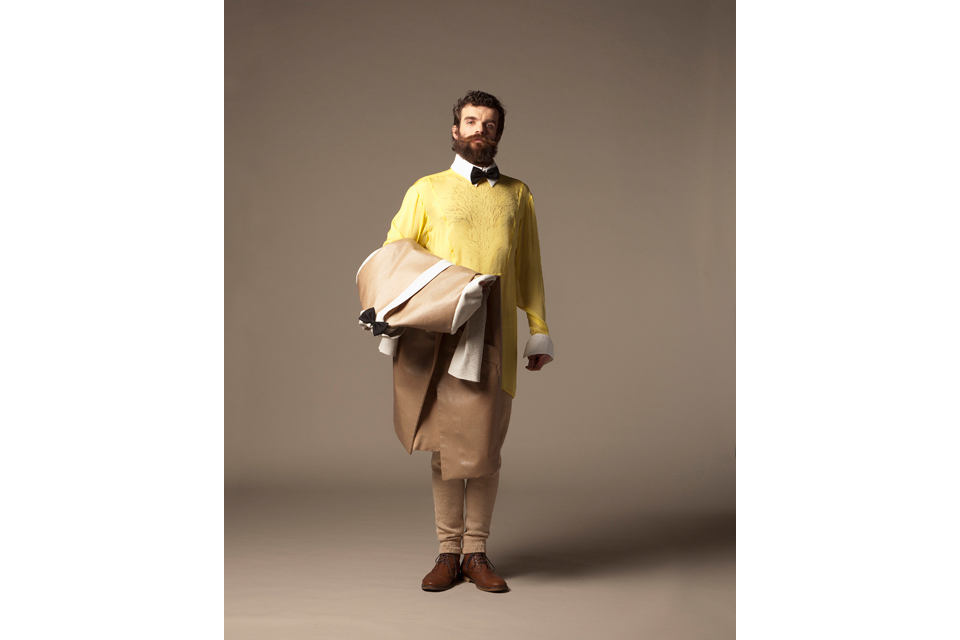 Breite Schultern, offene Hemden, Brusthaar. Glitzer, Flitter, enge Hosen. Das sind die 80er Jahre. Ich habe die V-Silhouette und die für mich typischen Charakteristika aufgegriffen und neu interpretiert. Legere Jacken wurden ersetzt durch klassische Mantelformen. Brusthaar quillt nicht aus offenen Ausschnitten, sondern wird direkt auf den Stoff gedruckt, sowohl auf die Brust als auch auf den Rücken. Die Farben sind zurückgenommen, damit die Form sich ungestört entfalten kann: beige, creme, taubenblau, rosé, zitronengelb. Fließender Seidenchiffon und feine Wollstoffe unterstreichen zugleich den femininen Charakter dieser Zeit. Die Fliege, zugleich die Schleife, verwirrt im Spiel um Männlichkeit und Weiblichkeit.