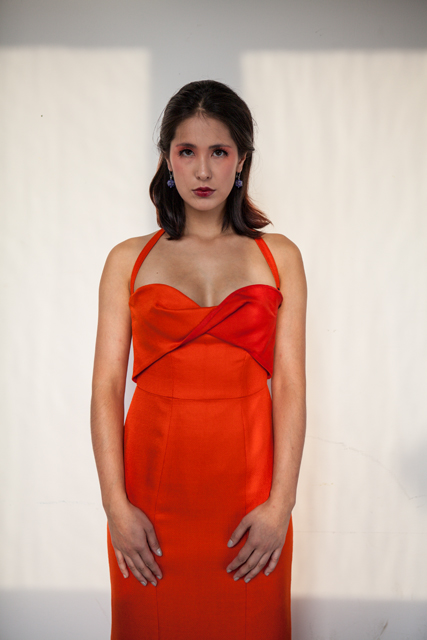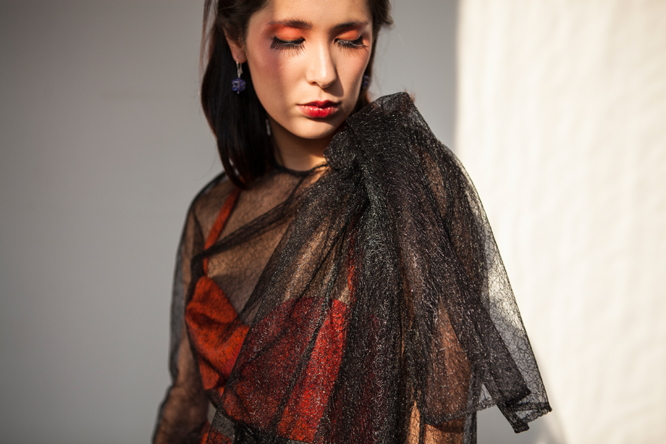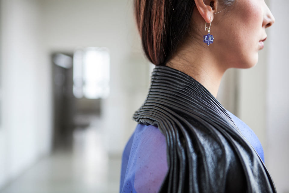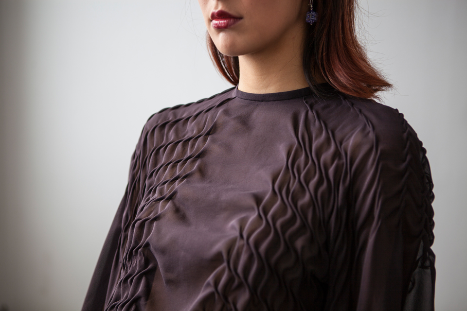 Blue Cloud. Eine Hommage an den Maler Mark Rothko und die Leuchtkraft der Farbe. Hauchzarter Seidenorganza und weiches Nappaleder sind die Malgründe, auf denen sich Handsiebdrucke zu noblen Farbklängen verdichten. Durch Überlagerung und Schichtung irisierender Flächen entstehen leidenschaftliche Kompositionen in Rot, Orange, Blau und Schwarz. Ausgewählte Schnitt- und Smoktechniken unterstützen den Effekt des Farbverlaufs. Raglan- und Kimonovariationen schaffen nahtlose Flächen und geben der Couleur Raum zum Atmen.
